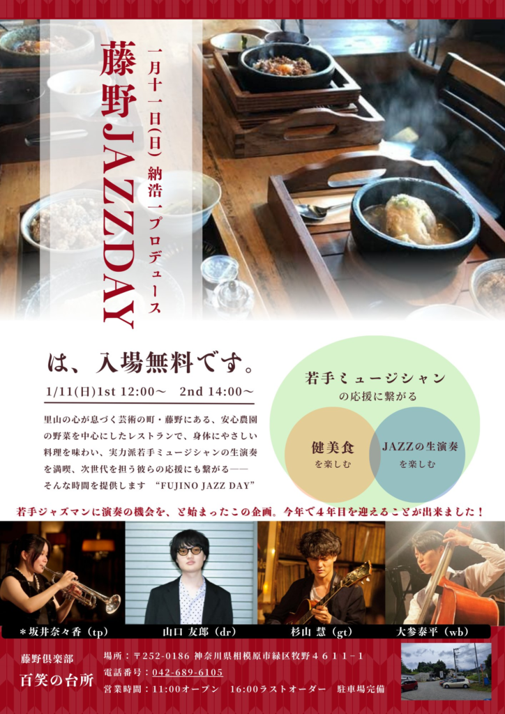 FUJINO JAZZ DAY 2026.1.11(SUN) 2025年12月24日 第1回12:00- 第2回14:00- 里山の心が息づく芸術の町・藤野にある、安心農園 の野菜を中心にしたレストランで、身体にやさしい 料理を味わい、実力派若手ミュージシャンの生演奏 を満喫、次世代を担う彼らの応援にも繋がるーー そんな時間を提供します “FUJINO JAZZ DAY” 前の記事 お知らせ一覧